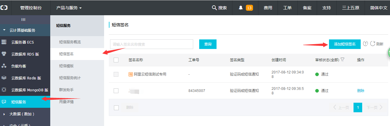 - 然后點(diǎn)擊短信服務(wù)-短信簽名-添加短信簽名