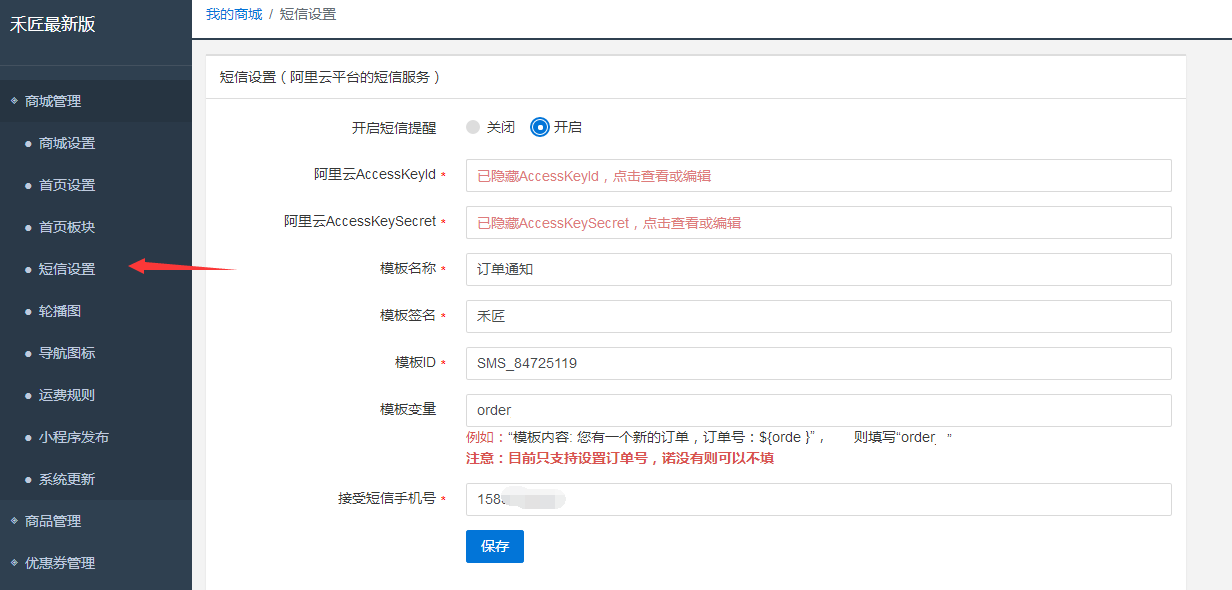 商城支持阿里云短信和阿里大于短信