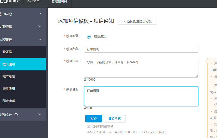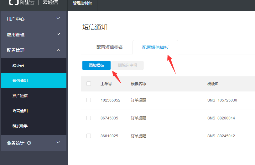 點(diǎn)擊配置管理-短信通知-添加簽名