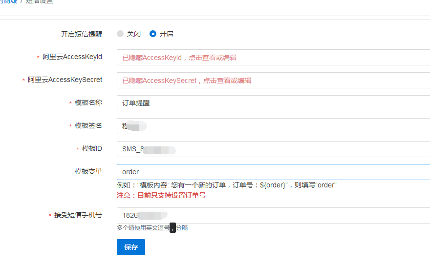 - 在系統(tǒng)后臺(tái)短信設(shè)置填寫(xiě)好對(duì)應(yīng)參數(shù)
