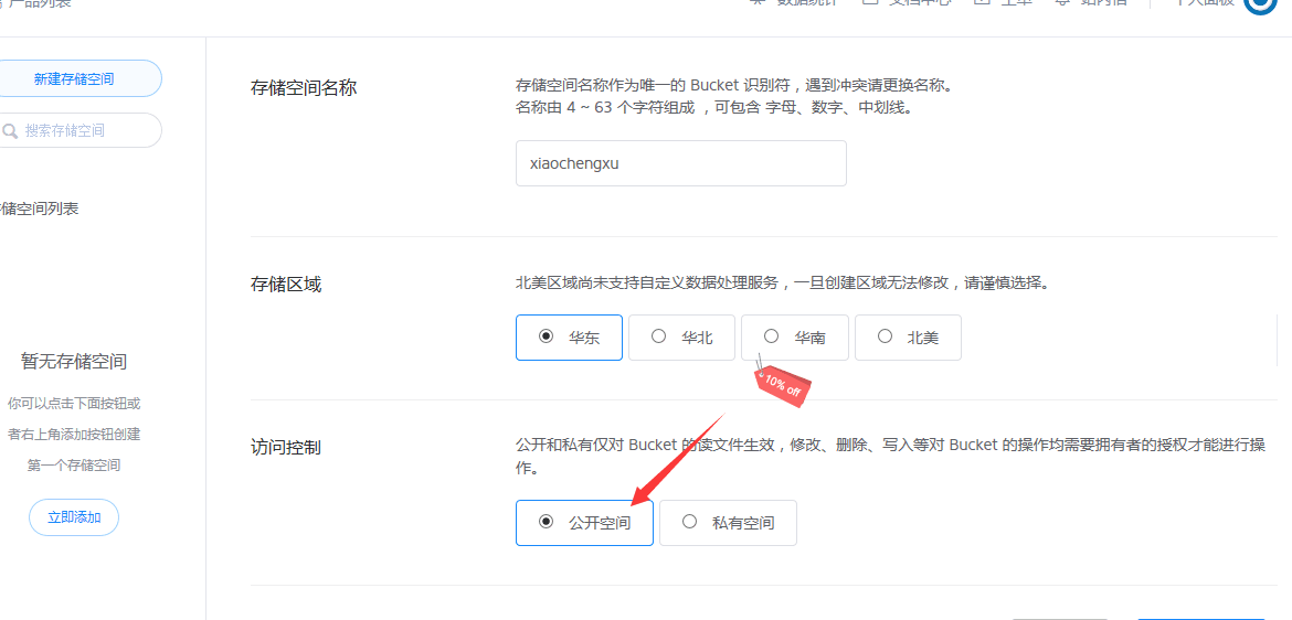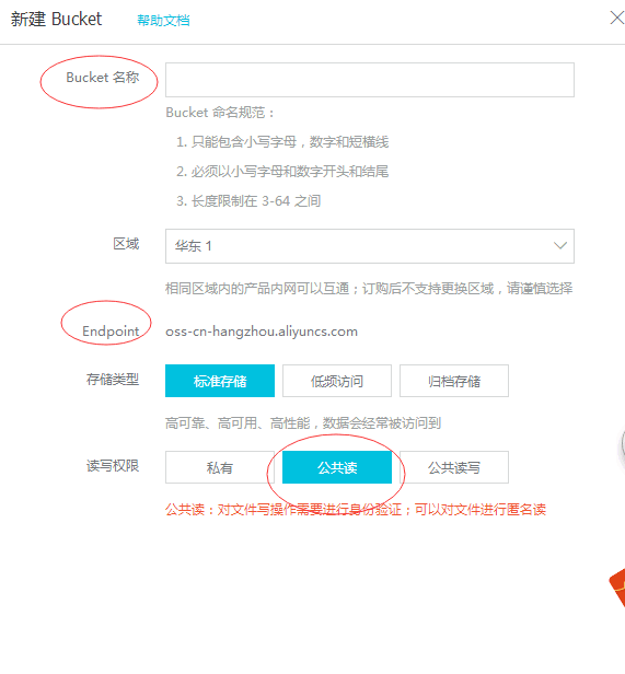 2. 創建Bucket,根據實際需要做選擇,讀寫權限至少公共讀;