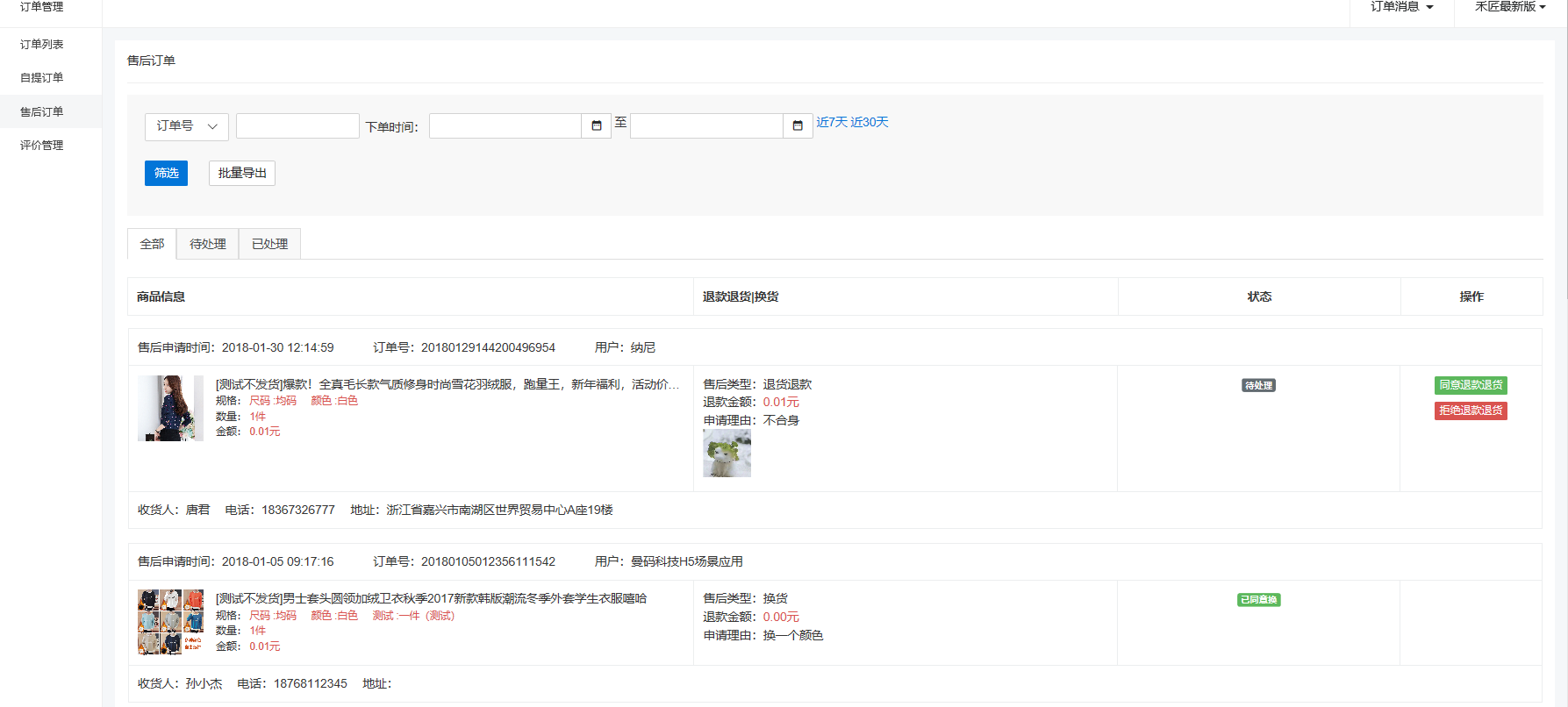 售后訂單主要是用于已收貨之后申請(qǐng)售后的訂單,在該頁(yè)面可以進(jìn)行退款審核操作,退款按原路返回給用戶(hù)
