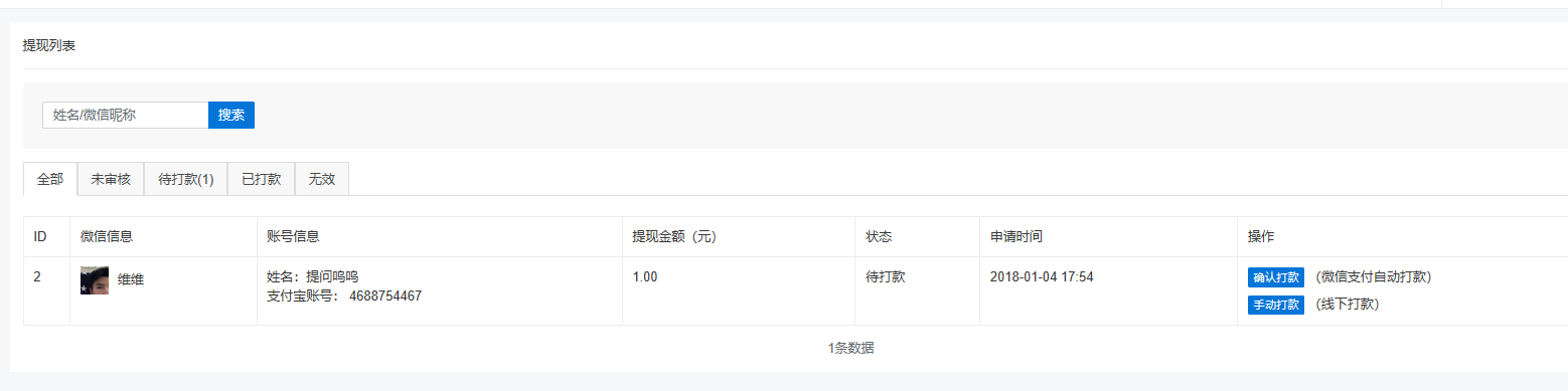 打款分為自動跟手動,1.自動,需開通企業付款到零錢功能 注:再商戶號產品中心開通,出現條件是商戶號注冊>90天,連續一個月有交易,若不滿足,則不在產品中心出現 2.手動,在第二步基礎設置中設置選項,根據分銷商填寫的微信賬號/支付寶賬號/銀行卡號 線下打款,直接點擊手動打款完成。
