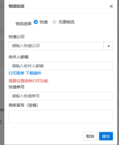 2。待發貨訂單:待發貨是已付款的訂單,自提訂單使用核銷員微信掃一掃核銷碼功能核銷,核銷之后狀態變為已收貨,也支持后臺發貨,發貨可以填寫快遞跟物流單號(商城管理-商城設置-快遞鳥),也可以使用電子面單功能(商城管理-;快遞單打印),也可以無需物流,并填寫商家留言,用戶可在小程序端看到